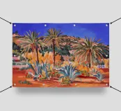 Un boschetto di palme e piante di agave scultoree circonda uno specchio d'acqua, creando un'oasi lussureggiante sotto un cielo blu brillante, la scena resa in uno stile audace e vibrante.