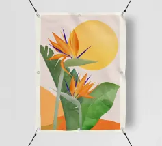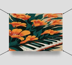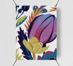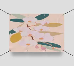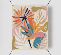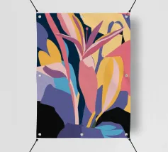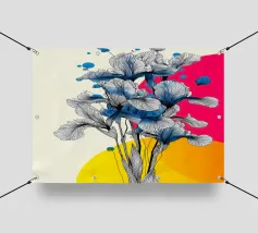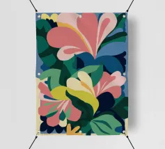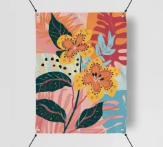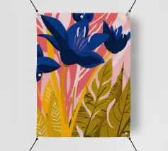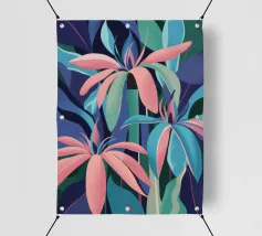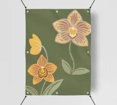 Un'illustrazione splendidamente dettagliata cattura l'eleganza di un'orchidea in fiore, con vibranti petali rosa, bianchi e gialli contrapposti a foglie blu intenso.