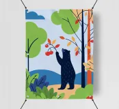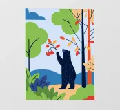 Godetevi la bellezza della natura selvaggia con questa illustrazione di un orso che raccoglie frutta in una tranquilla foresta. I colori vivaci e il design minimalista creano un'atmosfera pacifica e rasserenante.