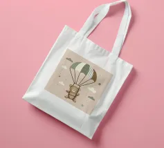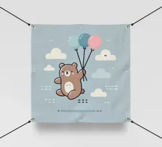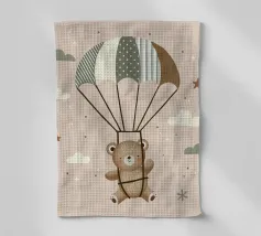 Questo simpatico motivo mostra un allegro orso che fluttua dolcemente nell'aria con un paracadute colorato. I tenui colori beige e pastello in combinazione con i motivi delicati e le nuvole minimaliste conferiscono a questa illustrazione un fascino senza tempo. Un disegno perfetto per gli amanti dei simpatici animali e degli scenari da sogno.Simpatico motivo con un orso fluttuante