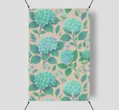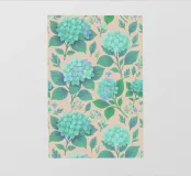 Bellissimo motivo floreale di ortensie con fiori di ortensia verde salvia e foglie verdi, su uno sfondo color pesca.