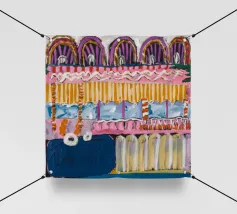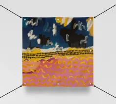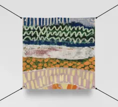 Un dipinto di paesaggio astratto caratterizzato da bande orizzontali di blu intenso nella parte superiore, che passano a gialli, rosa e arancioni, con un primo piano strutturato che suggerisce un campo o un fitto fogliame sotto un cielo vibrante.