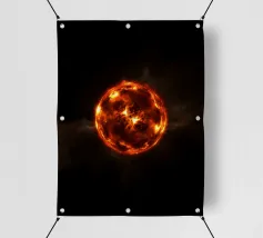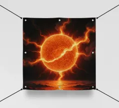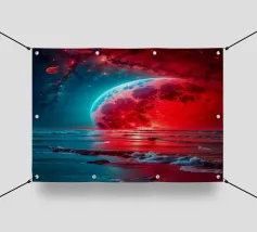 L'immagine ritrae una vista ravvicinata di Marte, che mostra la sua caratteristica superficie rosso-arancio. Un'importante fessura attraversa il pianeta, emettendo un bagliore ardente che suggerisce un'attività vulcanica. Il pianeta è immerso in un cielo scuro e stellato, con una debole nebulosa blu e rossa visibile sullo sfondo.