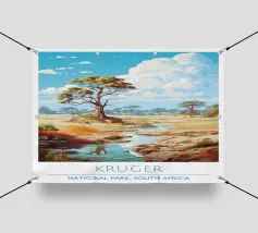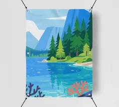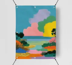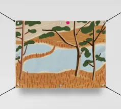 Raffigura un paesaggio tranquillo con uno specchio d'acqua in primo piano. Erbe alte e canne costeggiano l'acqua. Al centro, alberi dal tronco rosato e dal fogliame verde. Lo sfondo è caratterizzato da colline ondulate nei toni dell'arancione, del giallo e del verde, con un cielo blu e nuvole bianche in alto.