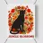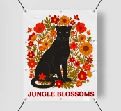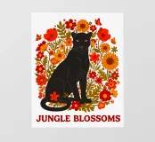 Sagoma di pantera nera circondata da fiori arancioni e rossi. Tavolozza calda, motivo floreale caratteristico; ideale per progetti audaci, tessuti grafici e accessori.