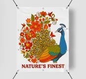 Una lussureggiante illustrazione di un pavone e di un bouquet di fiori rosso-arancio. Una tavolozza calda ed estiva, ideale per creare un'atmosfera botanica e di tendenza nella vostra casa.