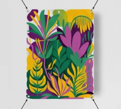 Una lussureggiante scena di giungla incornicia un grappolo d'uva viola, creando una natura morta unica e inaspettata che fonde il fogliame tropicale con la frutta del frutteto in una composizione vibrante.