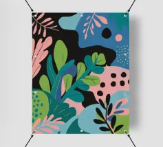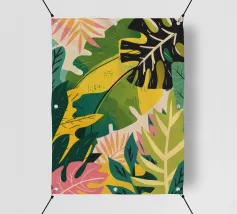 Una lussureggiante scena di giungla incornicia un grappolo d'uva viola, creando una natura morta unica e inaspettata che fonde il fogliame tropicale con la frutta del frutteto in una composizione vibrante.