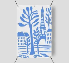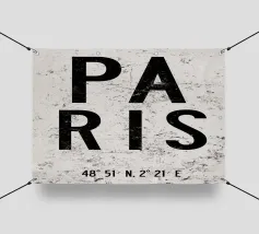 Questo poster moderno presenta la Torre Eiffel leggermente delineata dietro pennellate calligrafiche nere e dinamiche che scrivono "Paris" su uno sfondo rosa tenue.