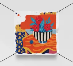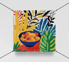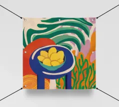 Una composizione astratta presenta una ciotola di fragole in mezzo a un turbinio di forme e motivi organici e colorati, creando un'interpretazione fresca e moderna di un classico dell'estate.