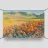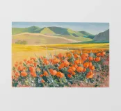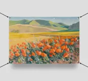 Un campo di papaveri arancioni crea un brillante patchwork di colori su dolci colline verdi e dorate, rese in modo stilizzato e moderno che enfatizza la gioia del paesaggio.