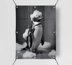 Un pulcino di pinguino è circondato da soffici bolle mentre è seduto in una vasca da bagno. L'ambientazione del bagno e l'atmosfera giocosa creano una scena affascinante e stravagante.