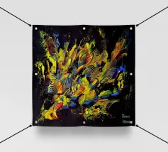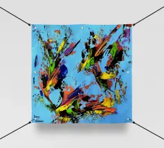 Il dipinto è colorato, con un mix di rosso, blu, giallo e verde. I toni accesi creano un'atmosfera gioiosa ed energica che cattura immediatamente l'attenzione.