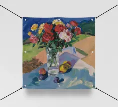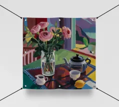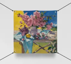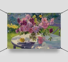 Una natura morta raffigura un vivace bouquet di peonie rosa in un vaso di vetro trasparente su un tavolo all'aperto tappezzato di rosa, con limoni nelle vicinanze e uno sfondo verde di giardino, che evoca la freschezza estiva.