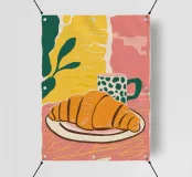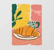 Un'affascinante natura morta di un croissant fresco su un piatto, abbinato a forme botaniche astratte su uno sfondo rosa. L'opera celebra il piacere semplice e delizioso di una colazione in stile parigino.