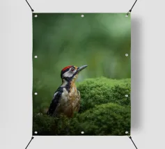 Un picchio si arrampica su un albero, beccando la corteccia alla ricerca di insetti. La luce del sole filtra attraverso la foresta, illuminando la vivace scena.