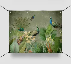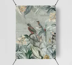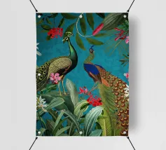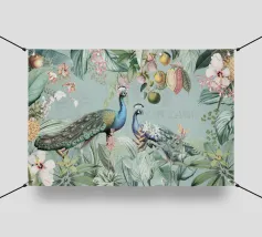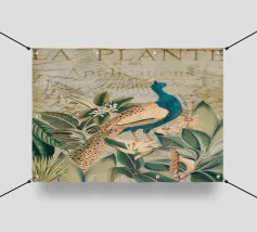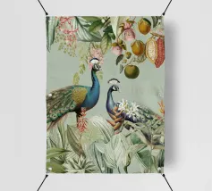 Questo collage vintage cattura l'eleganza dei tropici con una splendida composizione di lussureggianti foglie tropicali e frutti vivaci. Al centro, due splendidi pavoni si ergono con grazia, con le loro piume iridescenti che brillano nei toni del blu, del verde e dell'oro. Il maestoso piumaggio dei pavoni contrasta con il ricco fogliame, aggiungendo un senso di raffinata bellezza. Le sottili texture vintage dello sfondo esaltano l'eleganza generale, mentre i colori vibranti delle foglie e dei frutti danno vita alla scena, evocando un paradiso esotico senza tempo.