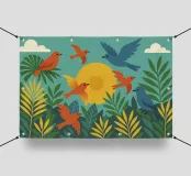 Date un tocco di colore alle vostre pareti con questo poster "Uccelli e sole". Uccelli rossi e blu svolazzano intorno a un sole dorato, circondato da vegetazione tropicale. Un poster retrò luminoso e allegro, perfetto per un look positivo e naturale.