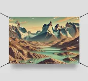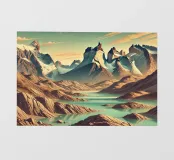 Poster di viaggio vintage di Torres del Paine in Cile con torri di granito frastagliate, laghi turchesi, pendii illuminati dal sole e neve pallida sotto un cielo limpido e ventoso. Forme geometriche pulite, una delicata texture della carta e una fresca tavolozza di montagne creano una stampa della Patagonia senza tempo, ideale per soggiorni, studi, cabine e decorazioni a tema viaggi.