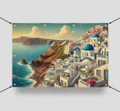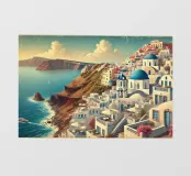 Poster di viaggio vintage di Santorini, Grecia, con case bianche sulla scogliera, cupole blu, strette scale e terrazze, una tranquilla baia dell'Egeo all'interno della caldera, piccole imbarcazioni sottostanti e una tenue foschia al tramonto. Le forme geometriche pulite, la sottile texture della carta e la tavolozza luminosa delle isole creano una stampa mediterranea senza tempo, ideale per soggiorni, camere da letto, arredamento costiero e spazi per le vacanze.
