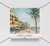 Questo vivace poster in stile retrò cattura il fascino solare della spiaggia di Sharm El-Sheikh. L'opera d'arte presenta una scena vivace con una splendida architettura costiera, palme lussureggianti e persone che si rilassano sulla spiaggia. Il mare turchese e le spiagge sabbiose sono resi con uno stile artistico dinamico e colorato, che evoca un senso di calore e di beatitudine vacanziera. La palette di colori caldi e invitanti e le pennellate fluide conferiscono all'immagine un'atmosfera unica e accattivante. Questo poster digitale di alta qualità (7000x5000 pixel, 300 dpi) è un'opera d'arte di prima qualità che celebra l'atmosfera serena e bella di questa spiaggia.