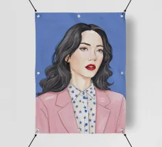 Una donna senza volto con rossetto rosso e capelli neri sciolti posa con sicurezza su un rosa tenue.