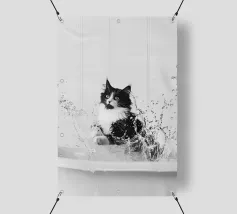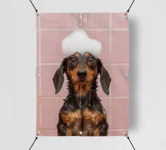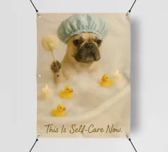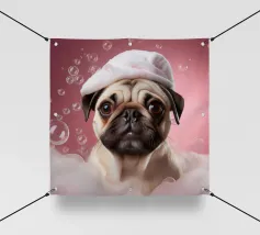 Un carlino siede in una vasca da bagno piena di bolle, circondato da piastrelle blu chiaro e da un rubinetto argentato. L'espressione del cane è allo stesso tempo carina e un po' triste mentre si fa il bagno.
