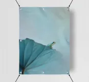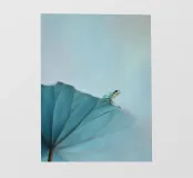 Questa opera d'arte mostra una piccola rana tropicale seduta sul bordo di una grande foglia blu. I tenui colori pastello e lo sfondo minimalista conferiscono all'immagine un senso di calma e leggerezza. Un motivo naturalistico moderno che unisce esotismo ed eleganza.