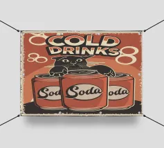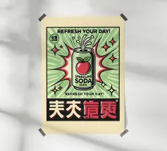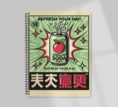 Una vivace lattina di soda esplode di energia su uno sfondo di raggi dinamici verdi e rossi, circondati da stelle. Le parole "REFRESH YOUR DAY!" sottolineano il tema vivace ed esaltante, con un testo in grassetto e colori di grande effetto.