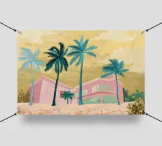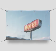 Una classica insegna retrò "MOTEL" risplende contro un cielo serale blu intenso, affiancata da palme in primo piano. L'immagine cattura un'atmosfera nostalgica e cinematografica che ricorda un classico viaggio americano in macchina.
