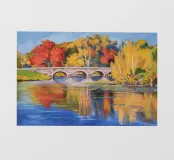 Un ponte di pietra attraversa un fiume ampio e calmo che riflette perfettamente i brillanti colori autunnali degli alberi sulle sue rive: rosso fuoco, arancione e giallo sotto un cielo azzurro tenue.