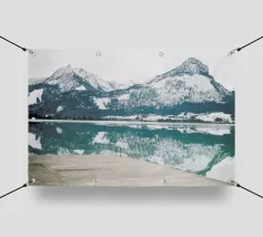 Un cielo azzurro e limpido si riflette perfettamente in un lago sereno circondato da maestose montagne innevate. Questa splendida scena cattura l'essenza della bellezza e della tranquillità della natura.