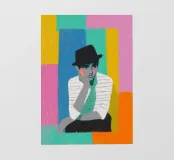 Ritratto di una persona in camicia bianca, pantaloni neri e cappello, seduta frontalmente. Stile di ispirazione matissiana con linee decise, pennellate espressive e uno sfondo di carta piatta e strutturata. Tavolozza di colori: rosa, arancione, verde, blu e giallo.