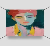Ritratto di persona con capelli rossi, in rosa con accenti gialli, occhi chiusi in posa rilassata. Lineamenti del viso morbidi, pelle luminosa e radiosa, ombreggiatura sottile sotto gli occhi, rappresentazione onirica, orientata ai colori e alle emozioni.