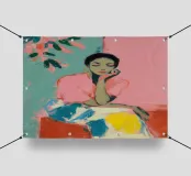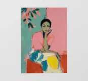 Quadro di una donna su un divano, in rosa e blu pastello, su uno sfondo rosa. Accento vegetale verde in primo piano. Moderno, minimalista e d'atmosfera, con forme chiare e superfici dai colori tenui per un'atmosfera armoniosa.
