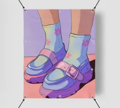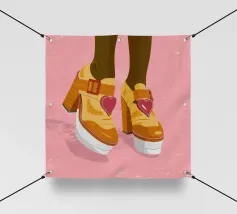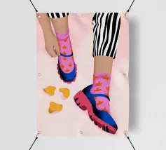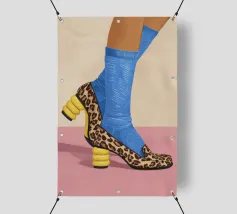 Una dichiarazione di moda moderna e stravagante catturata in un'illustrazione di un singolo sandalo nero indossato con un calzino arancione brillante. La composizione è un'interpretazione audace, giocosa e contemporanea della moda "ugly chic".