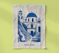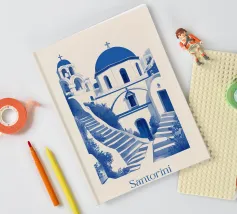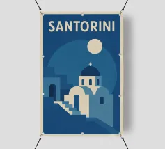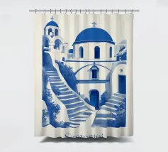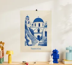 Poster minimalista in bianco e blu di Santorini, in Grecia, con l'iconica architettura cicladica con chiese a cupola, scale a chiocciola e fascino mediterraneo. Questa opera d'arte serena ed elegante cattura la bellezza senza tempo delle isole greche ed è perfetta per gli amanti dei viaggi e dell'arredamento costiero.