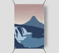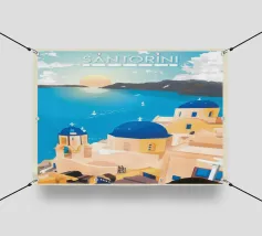 Design di viaggio minimalista della Grecia con le famose case bianche dell'isola greca di Santorini, le rocce vulcaniche e il blu del Mar Mediterraneo. Tipiche case graziose come nei villaggi di Oia e Fira.