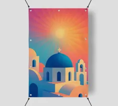 Poster retrò di Santorini, che celebra le sue famose cupole blu e le abbaglianti facciate bianche affacciate sul Mar Egeo. Una composizione pura che cattura l'eleganza e la luce delle Cicladi, perfetta per un arredamento mediterraneo chic.