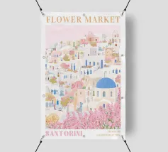 Una scena pittoresca di Santorini è caratterizzata da iconici edifici bianchi con cupole blu e una porta blu vibrante, che si affaccia sul mare scintillante sotto un cielo limpido con uccelli, incarnando il fascino idilliaco dell'isola greca.