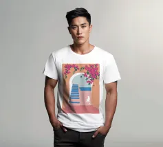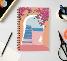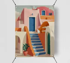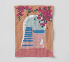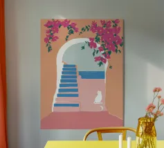 Un gatto bianco sonnecchia pacificamente in un classico arco mediterraneo ornato di bouganville rosa, affacciato su un mare blu. Questo pezzo cattura perfettamente il fascino sereno e solare di un'isola greca.