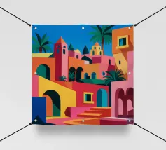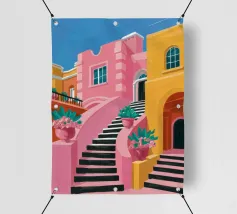 Quest'opera d'arte cattura la bellezza iconica di un'isola greca con i suoi gradini vivaci e colorati nei toni del rosa, dell'arancione e del rosso. La classica architettura bianca e blu incornicia la scena, creando un'immagine gioiosa e pittoresca che trasporta immediatamente in un vicolo soleggiato di Santorini.