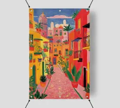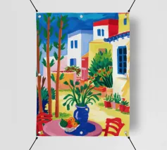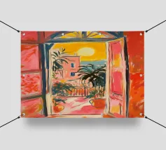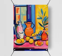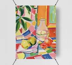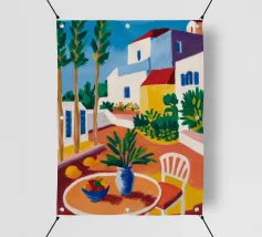 Una splendida natura morta di frutta fresca e bevande su un tavolo apparecchiato su un balcone, con una vista pittoresca di una classica città di mare del Mediterraneo. La scena è una fuga idilliaca e vibrante, che cattura perfettamente l'essenza di una vacanza sulla costa.