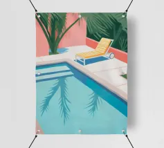 Poster raffigurante una piscina estiva con una scala arancione e riflessi d'acqua stilizzati. Un gioco di ombre, luci grafiche e una tavolozza solare. Perfetto per un look vintage e rinfrescante.