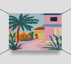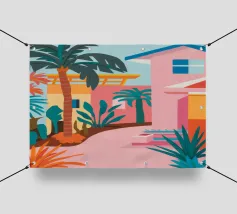 Scale rosse e vivaci conducono verso l'alto passando davanti a una finestra che rivela un cielo soleggiato, una palma e un sole splendente, a simboleggiare un viaggio verso una destinazione gioiosa.