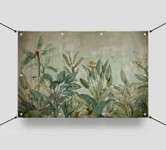 Questo vivace collage vintage mostra un gruppo di scimmie giocose al centro, le cui espressioni curiose e le pose agili conferiscono energia e fascino alla scena. Circondate da un rigoglioso fogliame tropicale e da fiori vivaci, le scimmie interagiscono con l'ambiente circostante, aggiungendo un senso di movimento e malizia. Lo sfondo, ammorbidito da texture vintage, evoca l'atmosfera di una giungla esotica. Il verde intenso e i colori delle piante creano un equilibrio armonioso, unendo la presenza vivace delle scimmie alla bellezza tranquilla di un paradiso tropicale senza tempo.