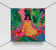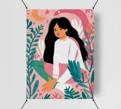 Illustrazione di una donna con top giallo a pois e pantaloni rosa, sdraiata sul pavimento. La sua posa rilassata e soddisfatta crea una scena di comodo, elegante e tranquillo svago.