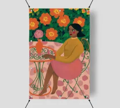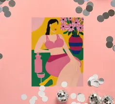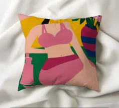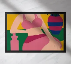 Una donna sicura di sé in bikini e pantaloncini fucsia si rilassa su una sedia con un drink, circondata da piante e fiori, incarnando il tempo libero estivo.