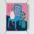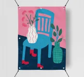 Un'affascinante ed eccentrica natura morta con una pianta in vaso appoggiata su una sedia blu brillante. La composizione è semplice ma piena di carattere, con colori vivaci e uno stile giocoso.