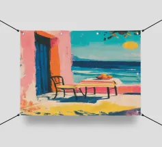 Sedie luminose si sparpagliano sulla terrazza di un caffè in riva al mare, proiettando lunghe ombre nella prima luce.